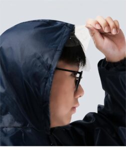 The drawstring rain hat features a short brim design. It can be adjusted to fit the size of the head according to the proportion of the head, and it can also be tucked behind the collar.